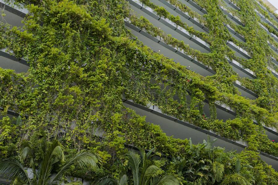 Engineering Precision: Jakob’s custom trellis system supports the specific espalier geometry envisioned by Jean Nouvel while accommodating the growth patterns of native Bougainvillea and Passion Vines.