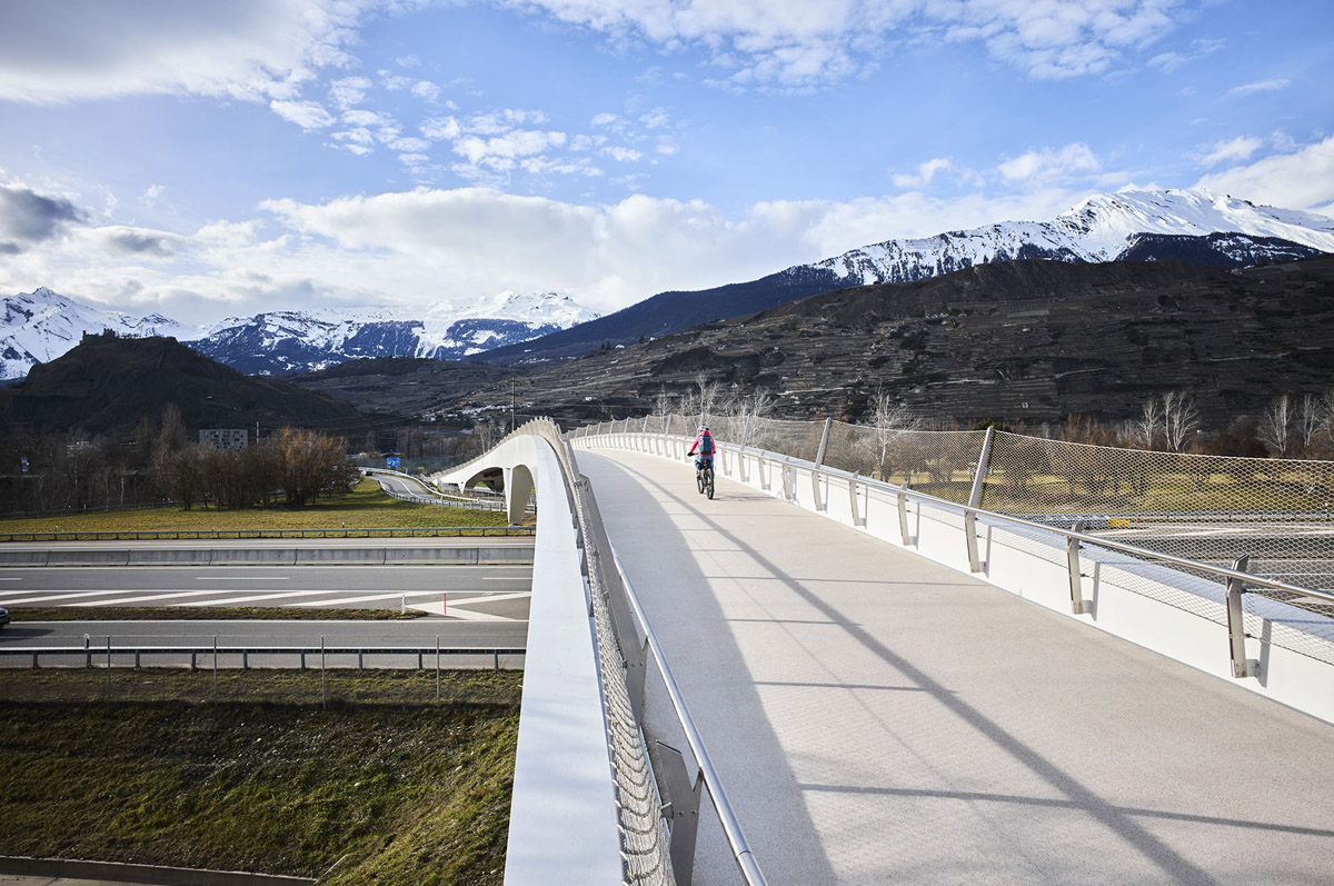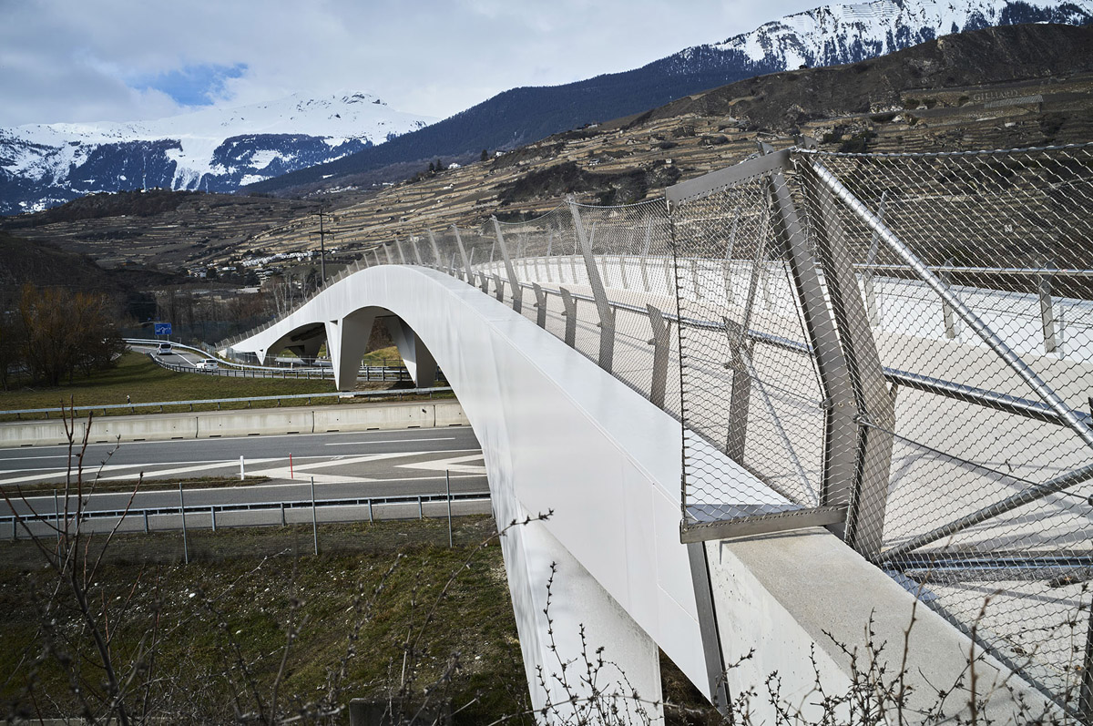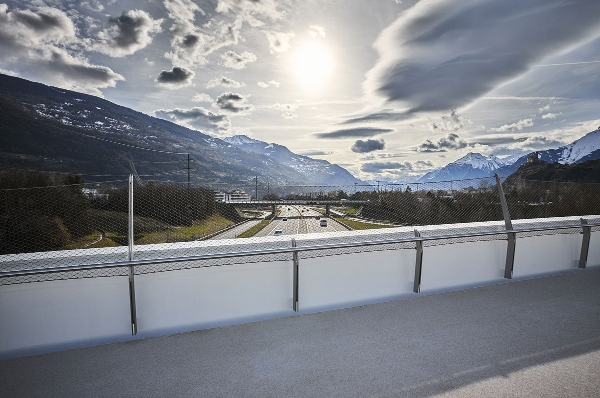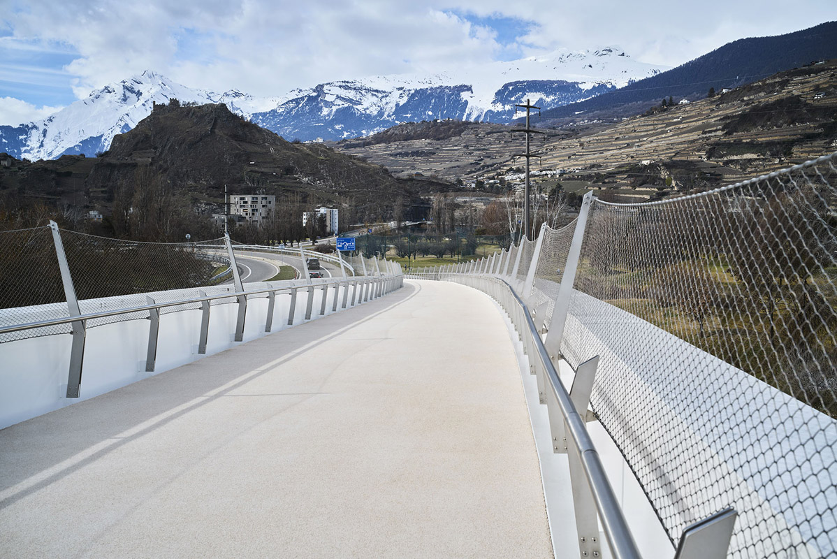 The pedestrian and bicycle bridge over the A9 freeway in Sion, Switzerland, is a study in restraint. The structure — clean white concrete, fluid geometry, alpine backdrop — was designed to feel open. The last thing the project needed was a heavy mesh cage sitting on top of the parapet, blocking sightlines and competing with the architecture.