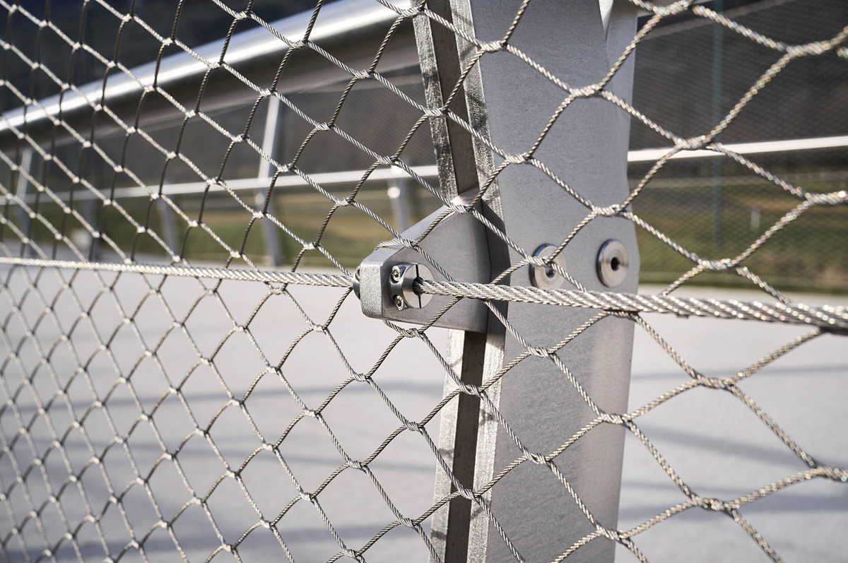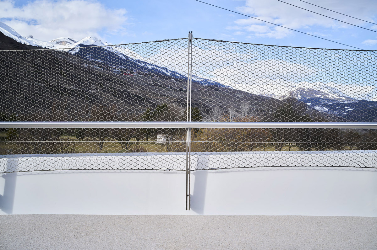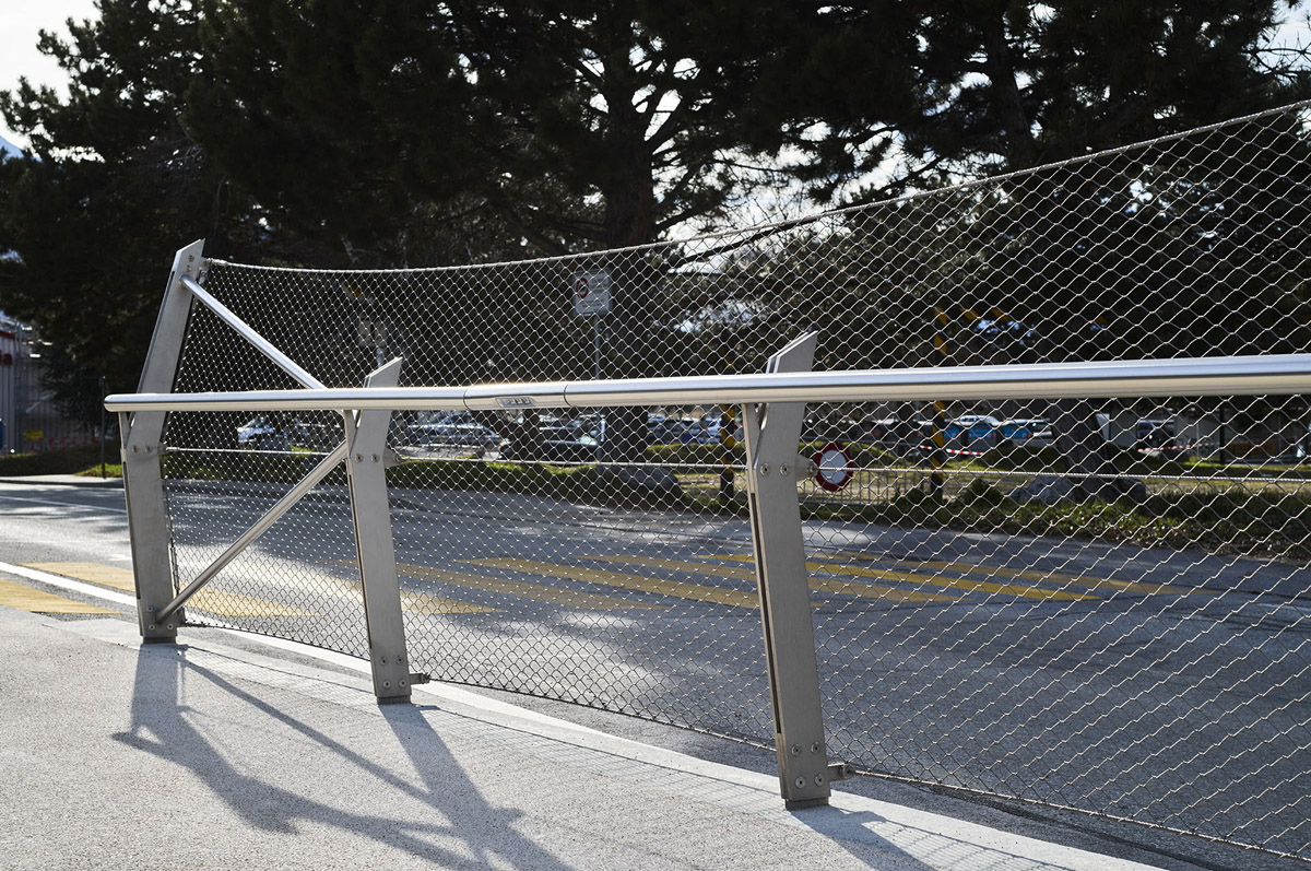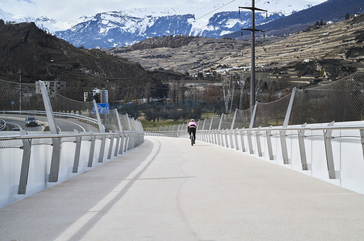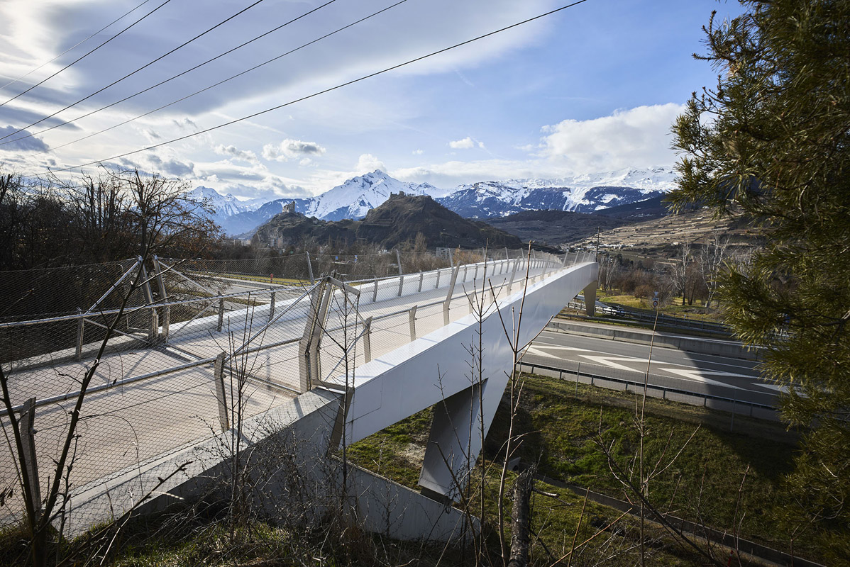 The pedestrian and bicycle bridge over the A9 freeway in Sion, Switzerland, is a study in restraint. The structure — clean white concrete, fluid geometry, alpine backdrop — was designed to feel open. The last thing the project needed was a heavy mesh cage sitting on top of the parapet, blocking sightlines and competing with the architecture.