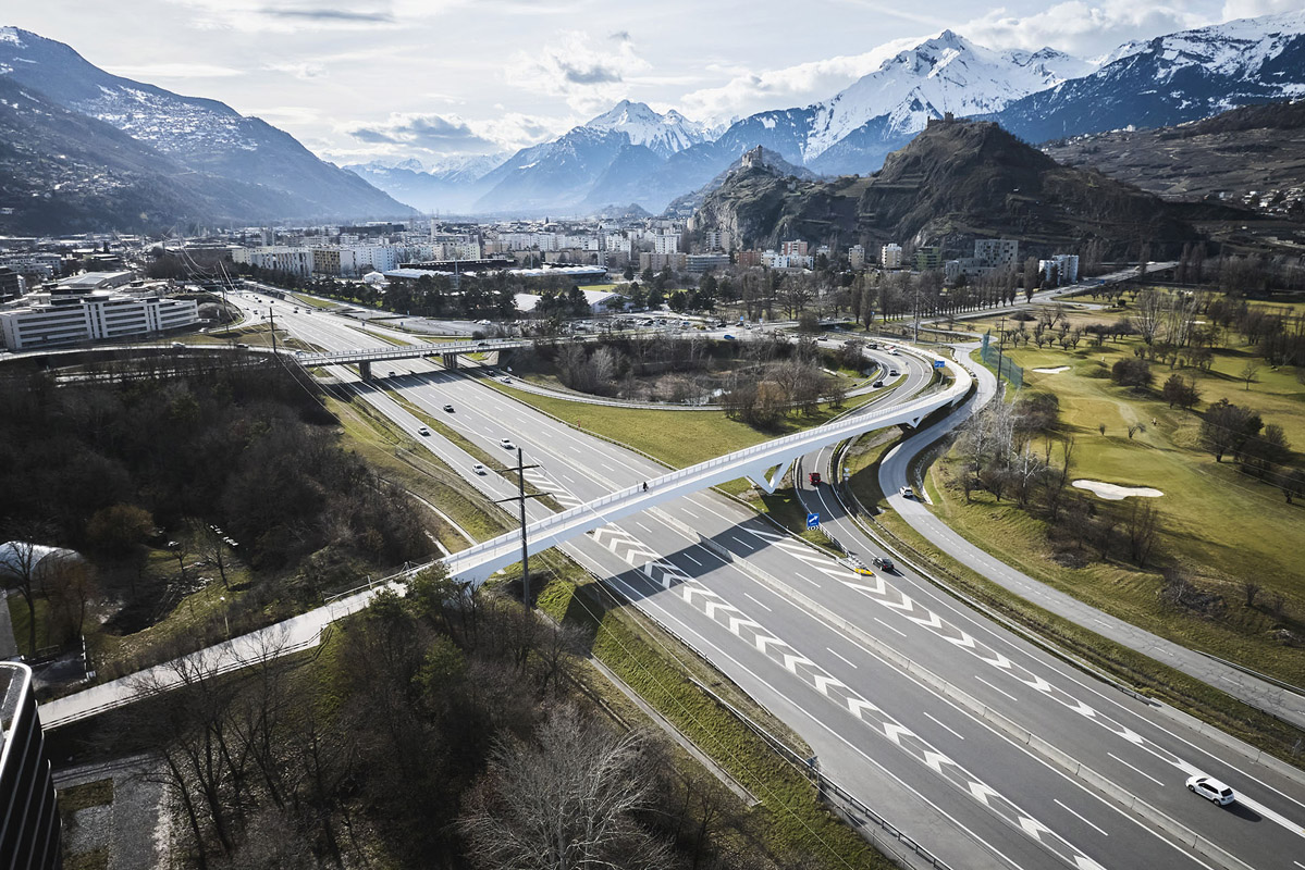 The Passerelle A9 serves a practical purpose: it links the Sion hospital center, the Echutes parking area, and the Tourbillon district without forcing pedestrians and cyclists into highway-adjacent traffic. At roughly 180 meters long and 4.5 meters wide, the bridge was designed to handle up to 5,000 pedestrians per day — a real working piece of urban infrastructure, not a one-off landmark.