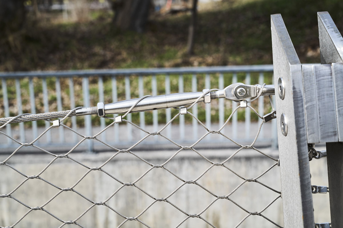 Jakob Rope Systems developed an integrated mesh solution using vertically tensioned Webnet — the same stainless steel rope mesh system used in zoo enclosures, green facades, and architectural railings worldwide, now applied to bridge fall protection.
